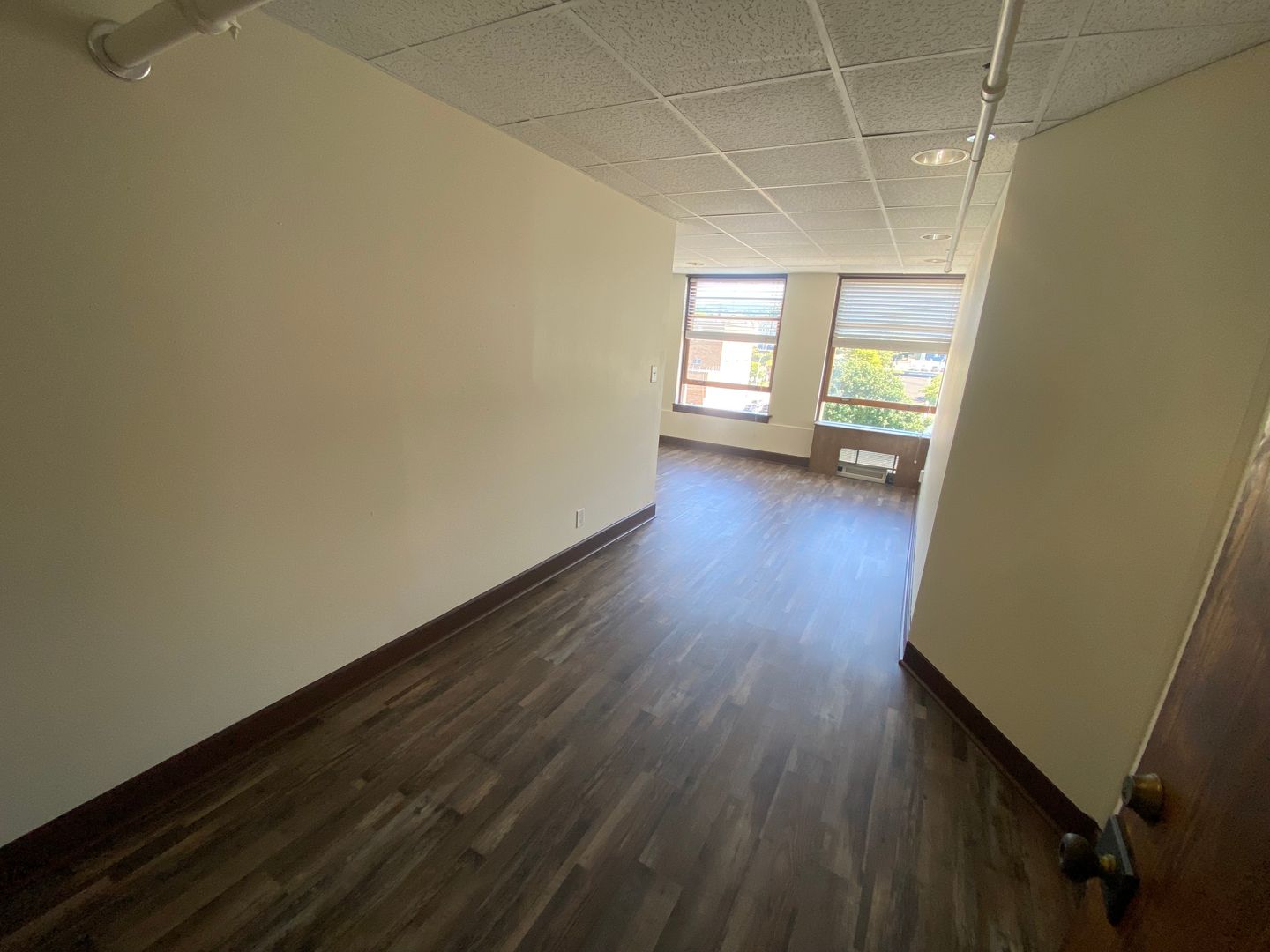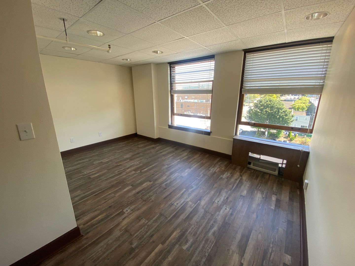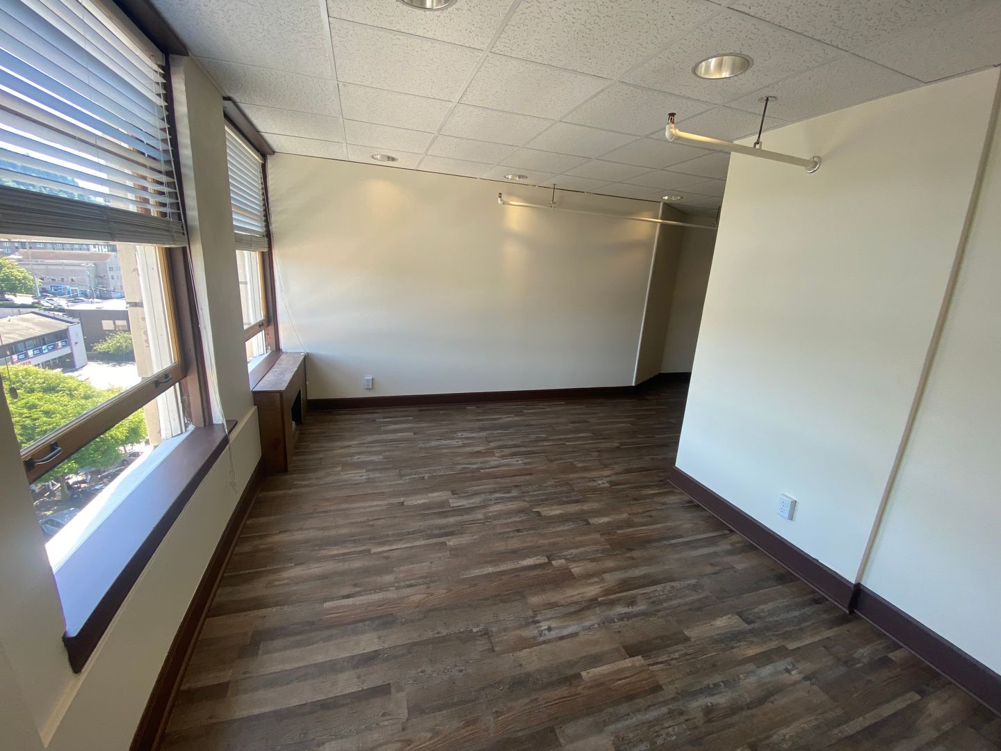 Suite 609 is a 269 square foot L shaped office with big windows that bring in plenty of natural light. This unit has a heating and cooling unit in it as well.