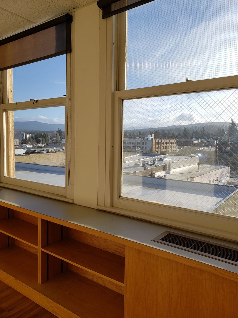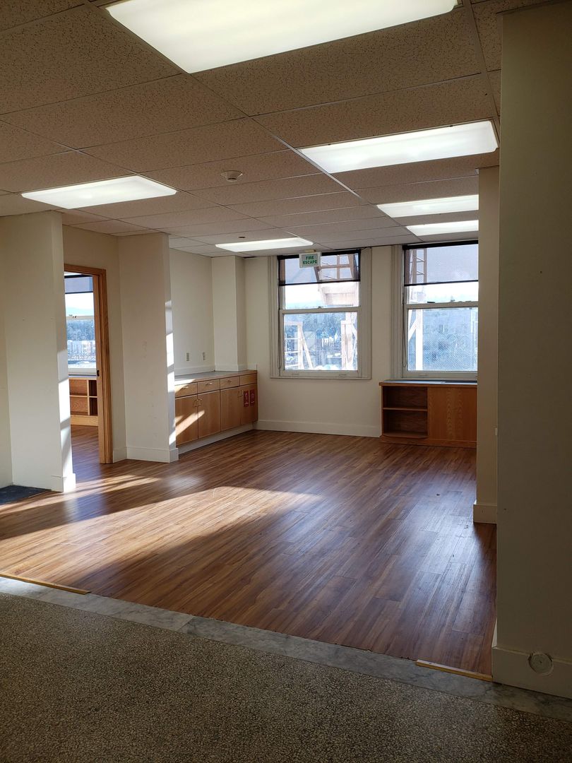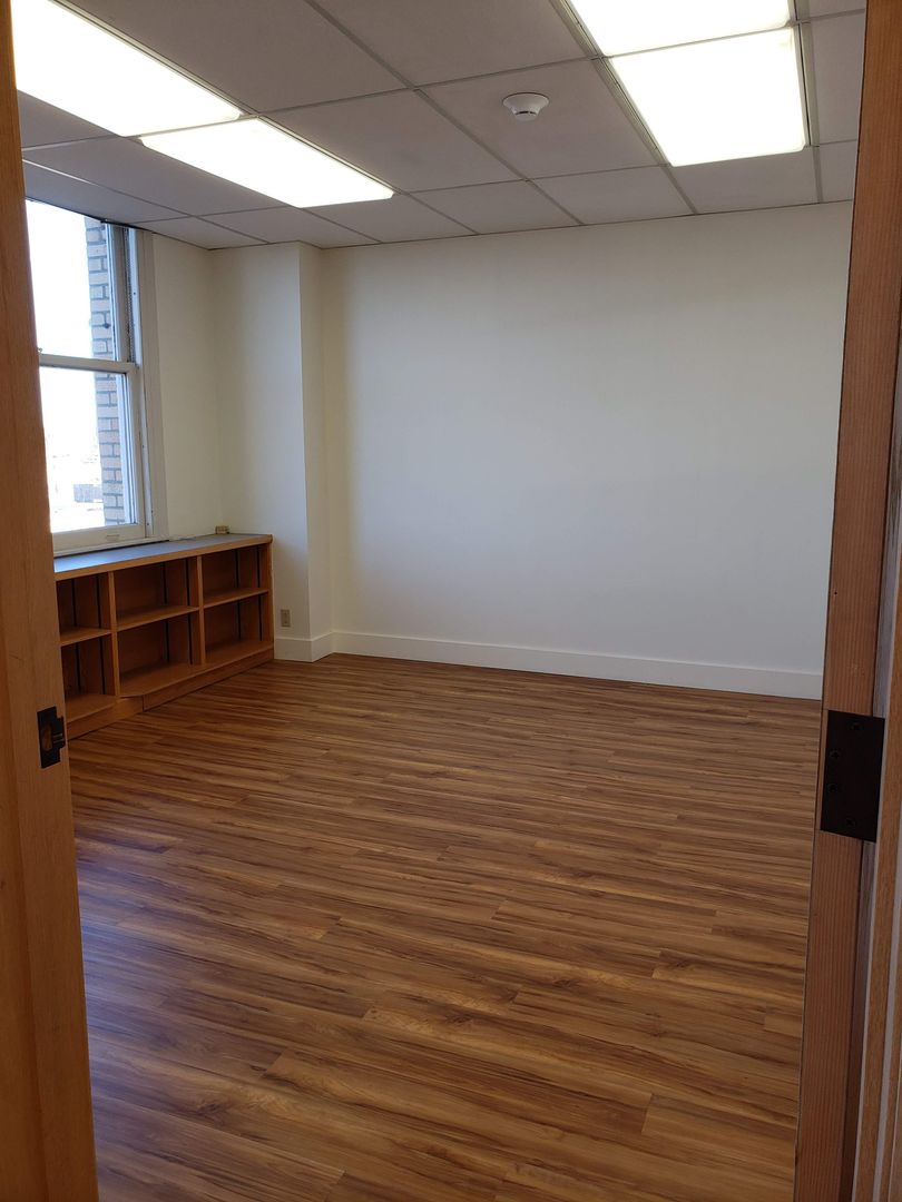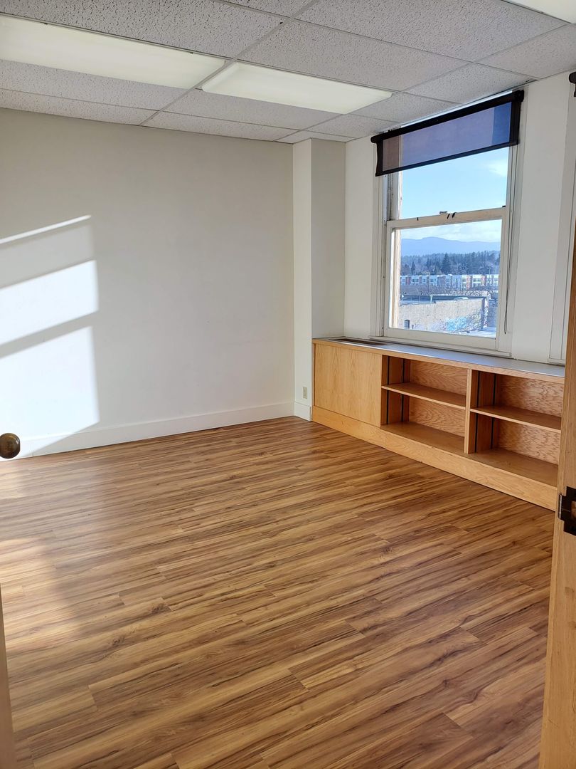 Suite 418 is a large, executive suite with bay, mountain and city views. Large windows bring in plenty of natural light. This suite carries much of the historic charm of the original building. Lovely reception area, 4 large offices, built in work spaces and cupboards throughout. Terrazzo flooring in entry. Break room complete with kitchenette.