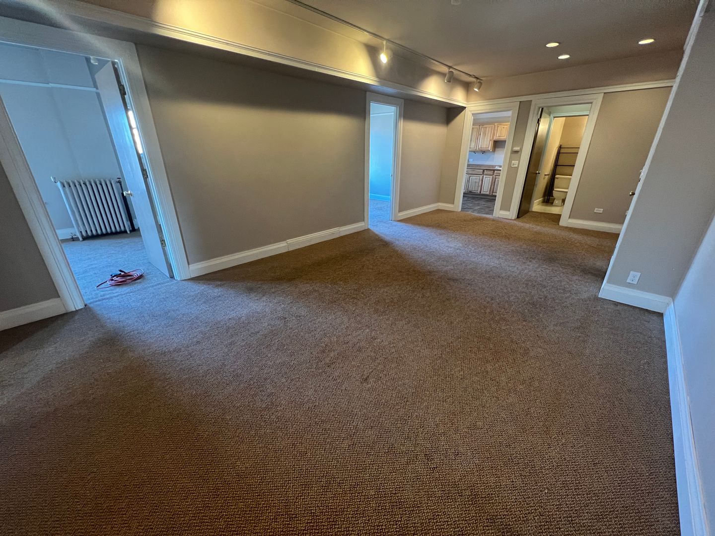 Three bedroom apartment with a large living room and kitchen. One bedroom has it's own bathroom.