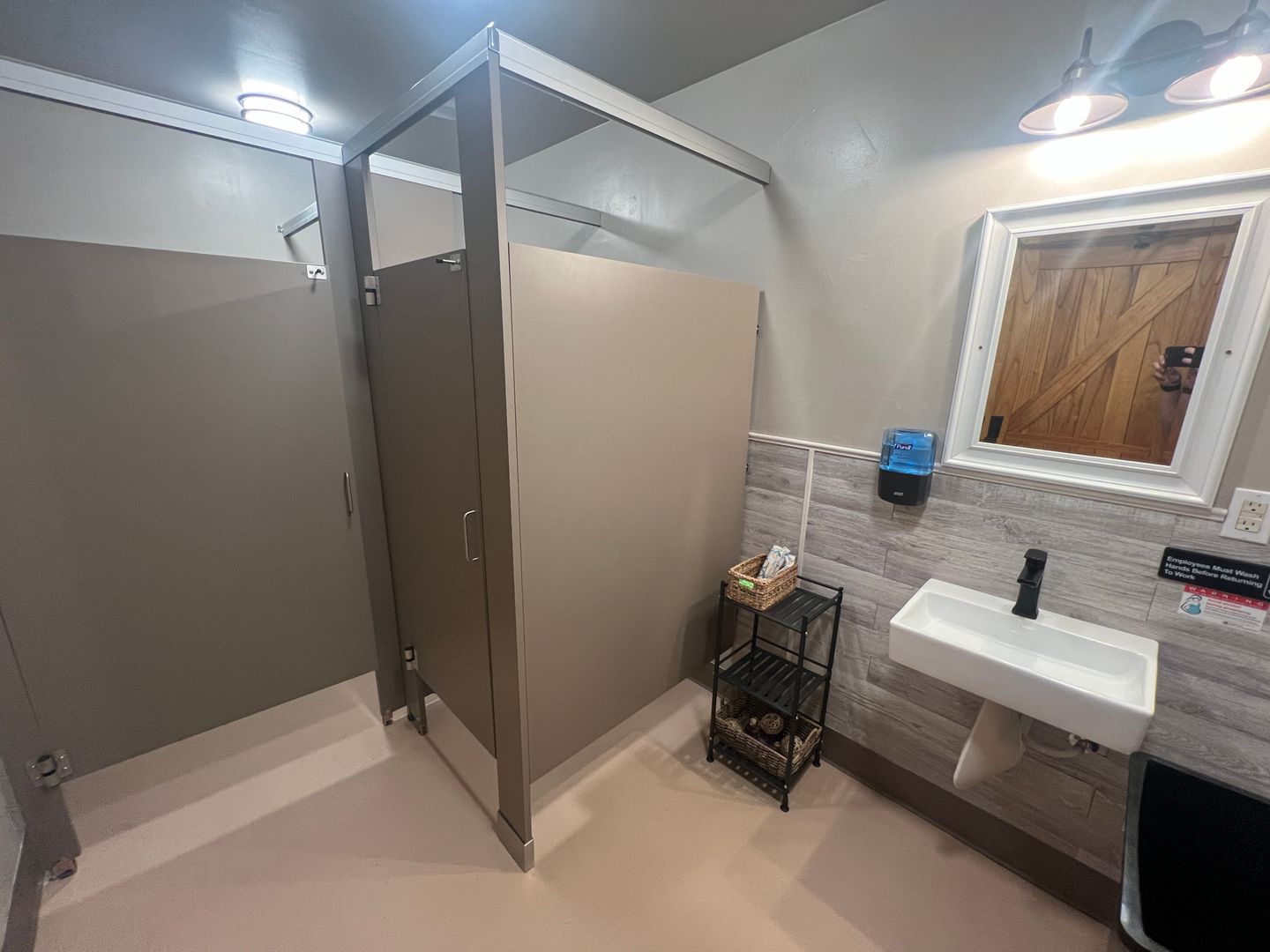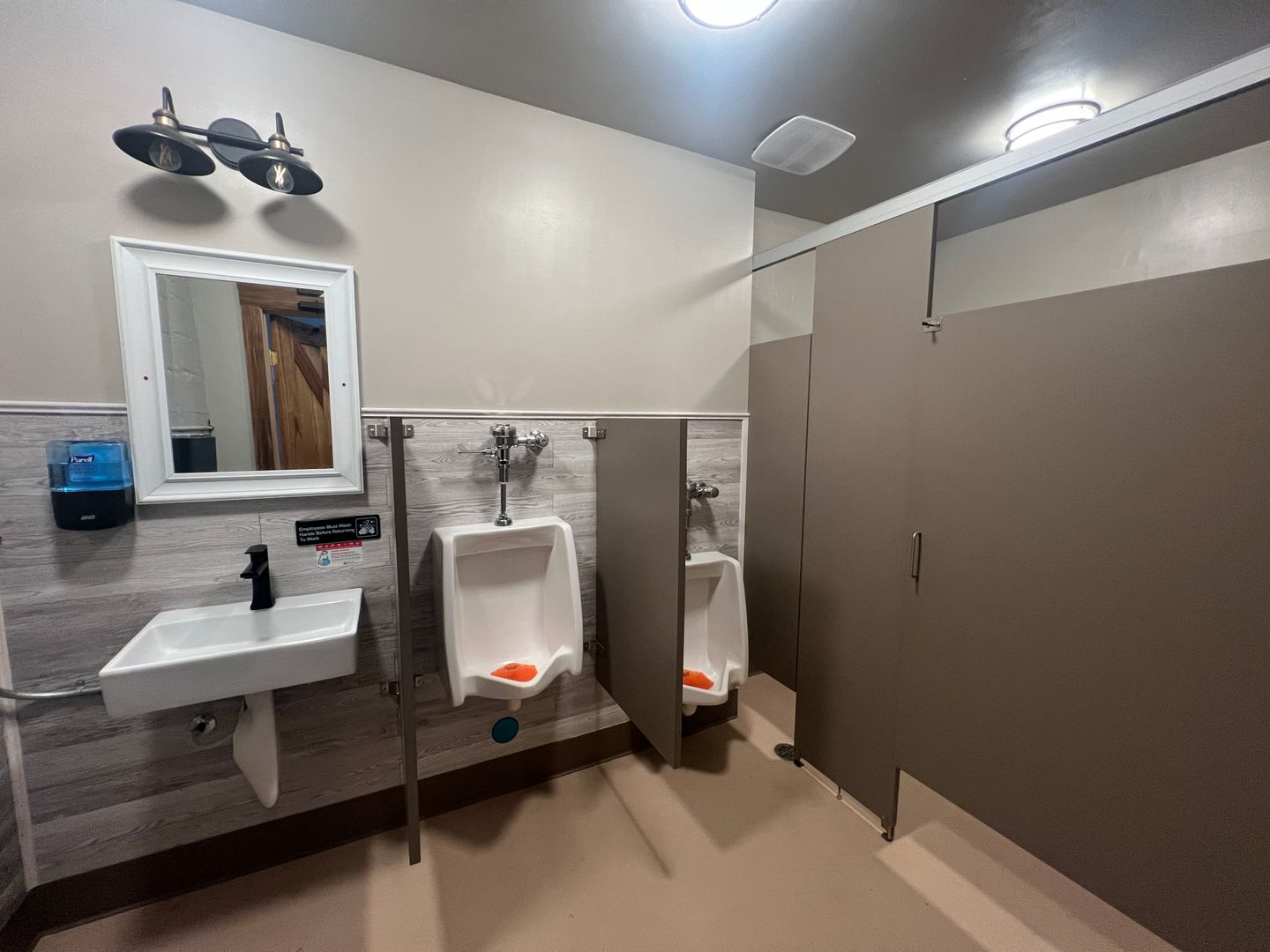 The main floor encompasses 2,160 square feet of versatile space, with two recently updated bathrooms, an abundance of natural light, ceiling sound panels, commercial sinks, and a prominent exterior marquee sign.